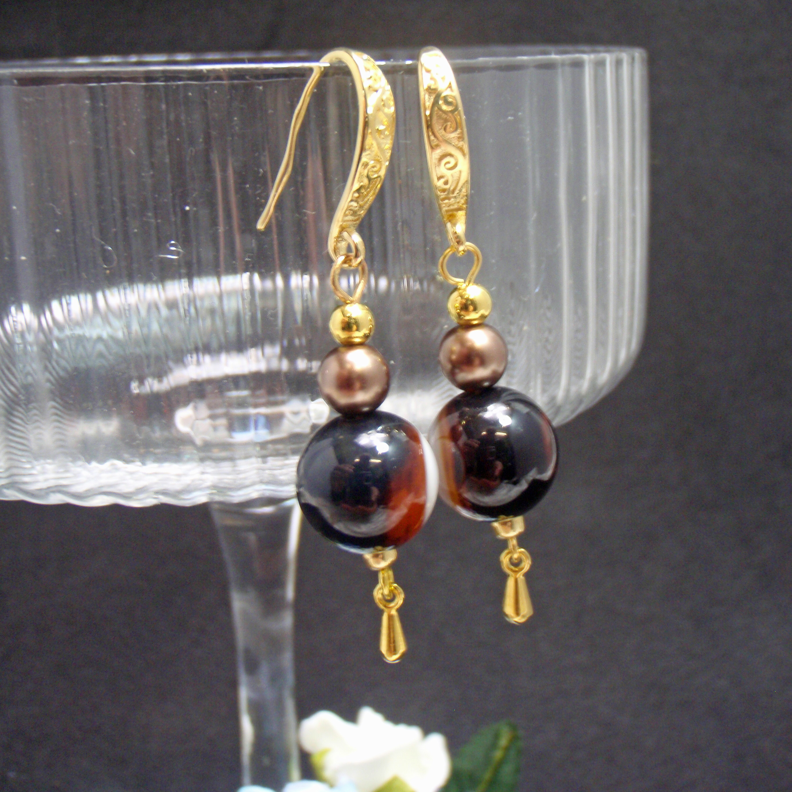 Beautiful natural agate bead earrings featuring warm brown colouring and subtle natural variations unique to each stone. Accented with gold‑coloured beads for an elegant finish. Finished with gold‑coloured, patterned fish‑hook style ear wires adding a refined, artisan‑crafted finish worthy of any curated jewellery collection. Lightweight, comfortable, and perfect for everyday or occasional wear. Matching bracelet and necklace available.