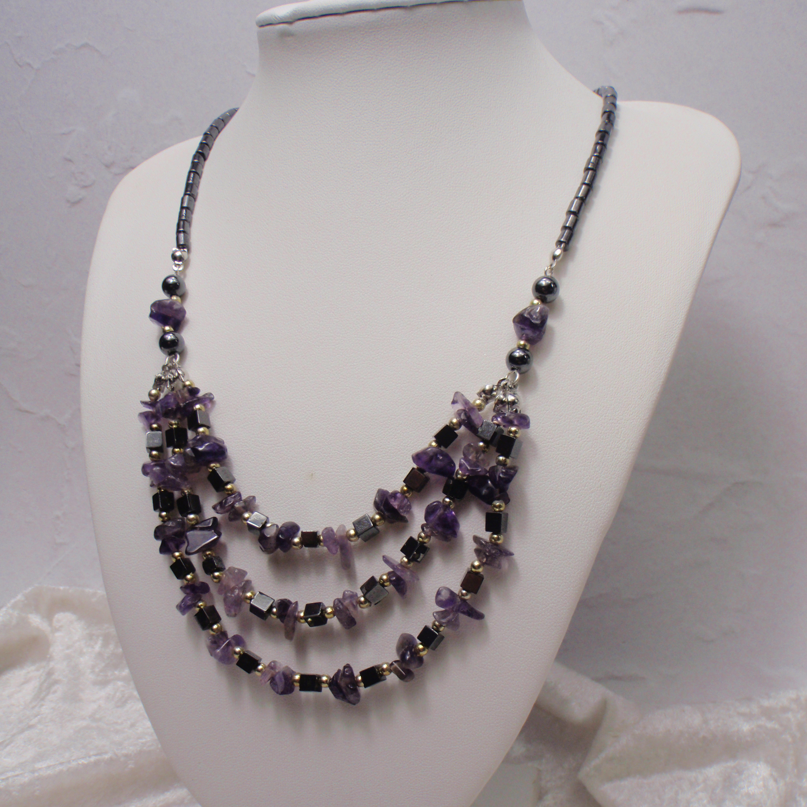 Elevate your jewellery collection with this exquisitely balanced necklace, thoughtfully crafted from luminous amethyst chips, sculptural hematite cube and tube beads, and delicately spaced round metal accents. The rich violet tones of natural amethyst create a soft yet striking contrast against the cool, reflective finish of hematite, resulting in a piece that feels both timeless and contemporary. Each bead is carefully chosen and arranged to highlight texture, shape and subtle movement, giving the necklace an effortless sense of refinement. Designed to complement both everyday elegance and special occasions, this luxury beaded necklace sits beautifully at the neckline, adding depth and sophistication without overwhelming your look. The combination of semi‑precious gemstones and polished metal details offers a harmonious blend of organic beauty and modern design, making it ideal for layering or wearing alone as a statement piece. Perfect for those who appreciate understated luxury, artisan craftsmanship and distinctive materials, this amethyst and hematite necklace makes a thoughtful gift or a lasting addition to a curated jewellery wardrobe.